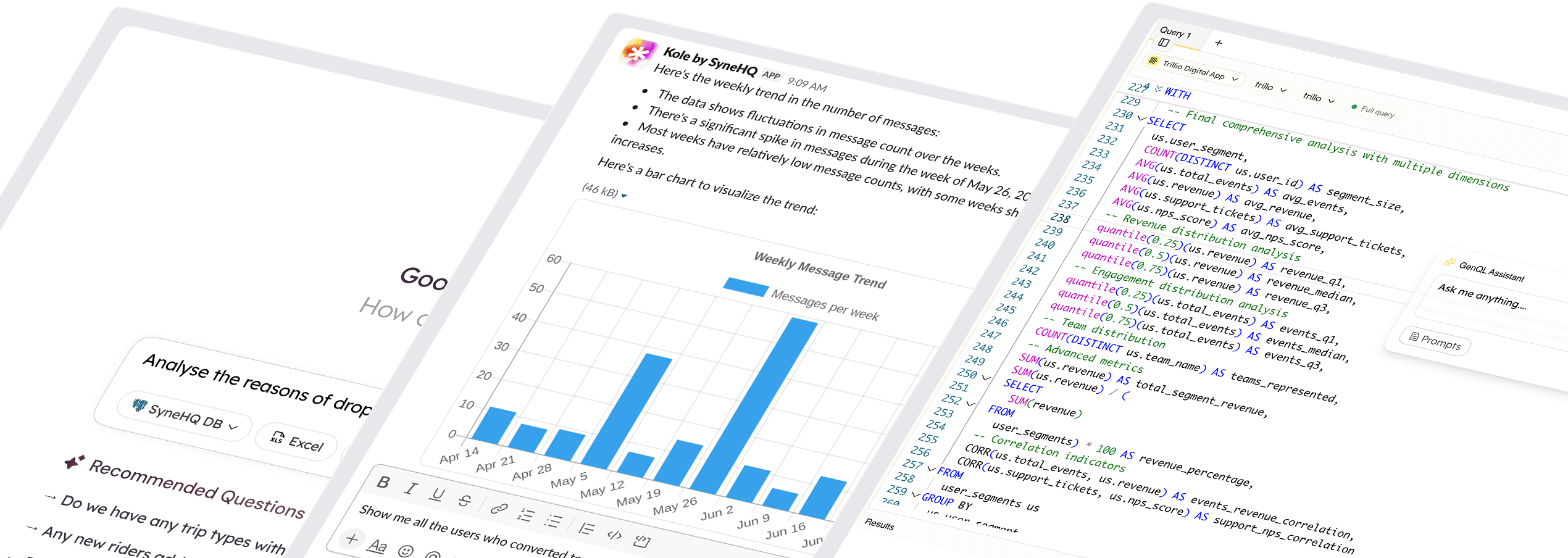 SyneHQ is your AI analyst and data engineers that every member can use to explore, reason and act on insights across all data sources from a single interface